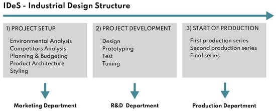 The project was created using the IDeS approach, which guides the company through the product development process by merging the technical and stylistic aspects of product design, from which stylistic design engineering (SDE) is generated. This method, introduced by Lorenzo Ramacciotti, ex-CEO of the design house Pininfarina, reveals a systematic methodology to make an automaker’s style more consistent and recognizable worldwide. IDeS combines tools for technical analysis and comparison of existing products on the market, such as quality function deployment (QFD), benchmarking, and top-flop analysis []. This strategy allows for the management of industrial design phases by involving the business organisation and sharing resources directly. In order to produce a high-quality product that is competitive in the market, it was discovered via the analysis of various case studies created using the IDeS technique that these products are customer-centric but also consider industrialization, technological, and financial restrictions. Project setup, product development, and production startup are the three key steps that make up IDeS. The designer is mainly concerned with the first two phases in which the product is conceived and takes shape throughout its design []. The figure summarises and collects all the stages of the IDeS process (Figure 2).