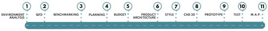 Moreover, the project setup stage is composed of the following phases: (a) environment analysis, (b) market analysis, (c) budgeting and planning, (d) architecture definition and (e) styling. Product development is composed of these phases: (a) 3D modelling (CAD), (b) prototyping, (c) testing and (d) optimization and final tuning (Figure 3).