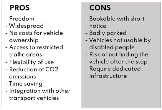Designing a smart, sustainable method of urban transportation was the project’s original aim. A summary of the pros and cons of micro-mobility sharing transport was made, considering the most relevant problems observed in various articles [,], and examining the benefits that encourage people to use this kind of service but more crucially the drawbacks that can serve as a signal for general development (Figure 6).
