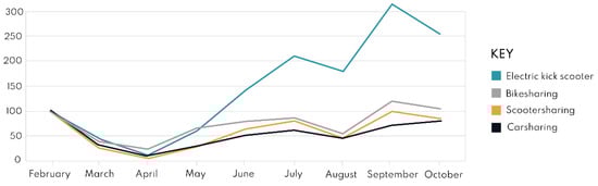 Since it is a very wide and complicated subject, statistics on mobility trends were examined (Figure 7) in relation to various means of sharing. The graph below shows how car sharing had a dramatic decline in the 2020s and how open and private-use automobiles were favoured [,]. This is a negative effect of the pandemic, as sanitation has turned into a crucial and necessary factor in individual transportation selection.