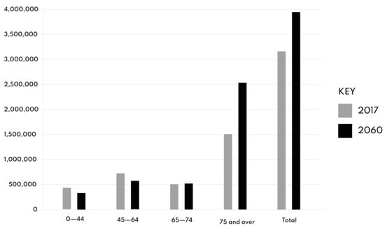 After an in-depth examination of all available means of transport, they are not fit for private and single usage by those with limited mobility. Among all the options evaluated, three were chosen: microcars, e-bikes, and scooters. They were thought to have the best attributes in terms of micro-mobility, but mainly because they are most aligned with the project’s goal. The following qualities must be considered: license-free operation, vehicle compactness, ease of use, ubiquity, and access to LTZs []. During this additional examination, the issue of the lack of accessible public transportation vehicles for individuals with disabilities emerges prominently. As a result, substantial study was conducted on these people’s urban mobility demands and challenges. It can be shown that, according to a Unipolis association forecast based on ISTAT statistics, persons with limited mobility will grow by 25% by 2060 owing to an ageing population (Figure 8) []. Since there is a present and future need to adapt urban transportation to a different and more inclusive public, this unequal increase will result in significant change.