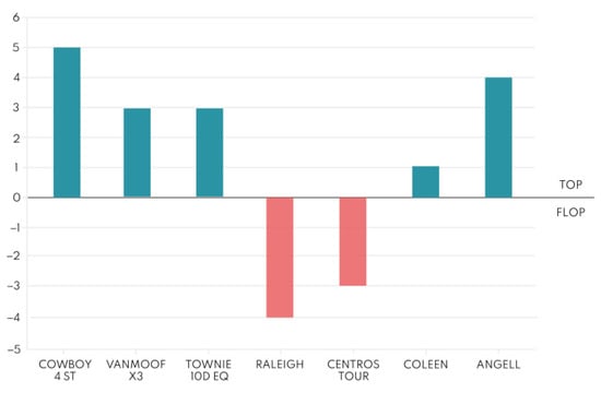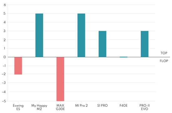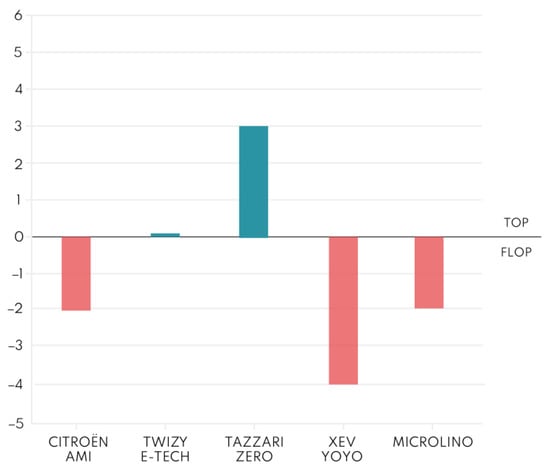 The competitor’s analysis was carried out on the three categories of sharing vehicles considered to be the best for urban mobility: microcars, e-bikes, and scooters. Microcars were selected because despite being very compact, they have two seats and some even have a trunk; these features make it practical and easy to use in the urban environment. The e-bike was selected because of its ease of use and the ability to get almost anywhere and thus be very ubiquitous. The scooter, on the other hand, was selected because it is a vehicle that is rapidly growing in use. All the vehicles that were analyzed have electric power because it is the most compatible with the sharing mode. Benchmarking was divided into three parts (one for each vehicle) and common technical characteristics were chosen in order to compare. For each benchmarking (see Table 5, Table 6 and Table 7), top-flop analysis was performed (Figure 10, Figure 11 and Figure 12), and the degree of innovation to be achieved and exceeded was calculated. The benchmarking method is explained more thoroughly in Section 2.1.2.