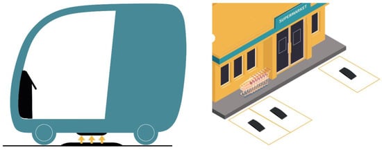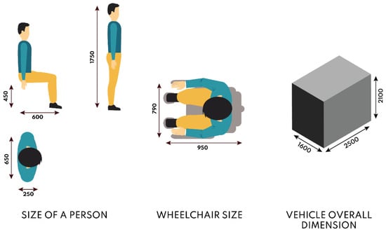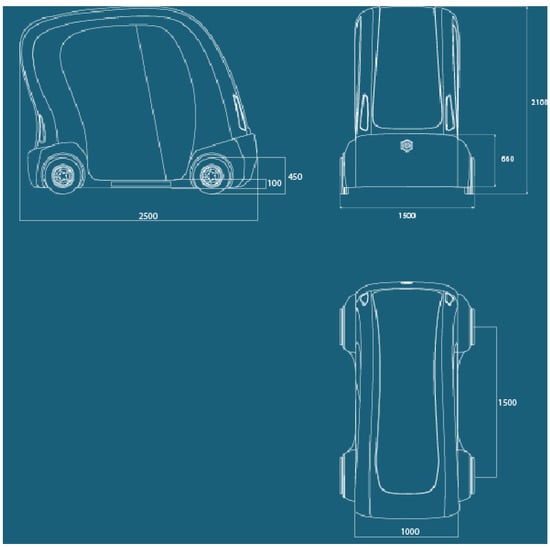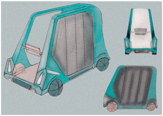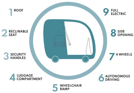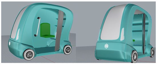 The recent pandemic period has brought to light the changing demands and needs of people to travel in urban centres and provided some interesting insights into the decisions and changes that can be undertaken in the near future. In particular, sharing services, where simultaneous or sequential sharing by several users for the same vehicle seems to be the key to the service. Therefore, the opportunities and limitations of sharing vehicles have been analyzed and put under the spotlight []. It was possible to analyze how the car fleet continued to grow in 2020 despite the economic crisis, and cars on the road are just under 40 million (39.7, 0.4 percent more than in 2019) with the motorization rate rising to 66.6 vehicles per 100 inhabitants. As a counterpoint to this trend, it is possible to imagine a parallel and alternative model to partially replace the travel needs covered today by private vehicles, which demonstrates an often poor overall efficiency between the space occupied, and therefore the traffic generated, and the number of people moved, since the occupants on board result statistically with an average value of less than half of the total seats available []. To find a solution to these problems [], a revolutionary future scenario on urban mobility in 2060 was imagined. It is assumed that many people will give up owning a vehicle and choose alternative means of transport, therefore car manufacturers will push towards the production of sharing or self-driving vehicles. Governments will have to give incentives for the creation of new dedicated infrastructure. Furthermore, it is supposed that numerous traffic-restricted zones will be introduced to preserve the livability of the urban environment and reduce pollution in cities, especially in areas characterised by small spaces and high population density, such as historic city centers. As a result, cities will be less accessible [,]. This change certainly turns out to be of great magnitude, and the most effective way to make it happen, and thus entice citizens to replace their vehicles with shared alternatives, is for these services to be very functional, efficient, and require minimal user effort. With these considerations in mind, the concept for a self-driving sharing vehicle was devised that would meet the needs of the broad target audience using concepts derived from the design for all philosophy, and would make a high level of ubiquity attainable, with extremely simple operation, and allowing it to be used even by people without a driver’s license [].