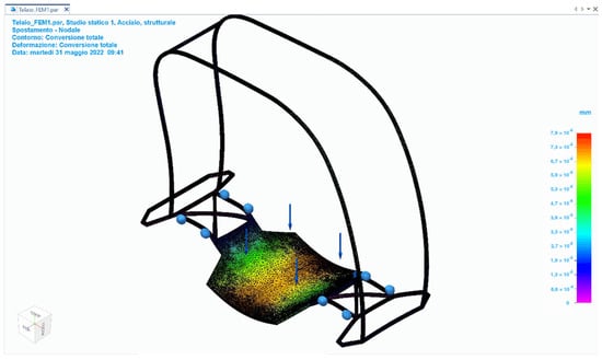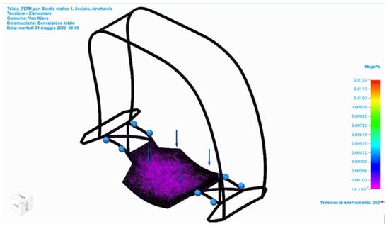 To examine the deformation of the frame under a particular load, several FEM-type calculations were performed using Solid Edge software. The material selected for the FEM investigation was structural steel. The first kind of study used a 1200 N load distributed on the centre section of the frame where the user would stand, resulting in a maximum displacement of 7 × 10−5 mm, which was found in the central region (Figure 24). Fixed limitations were set at the frame’s connection points to the remainder of the mechanical components. The maximum stress according to Von Mises was 1.9 × 10–8 Mpa (Yield Stress: 262 MPa) based on the second study, which was performed under the identical constraint circumstances and loads (Figure 25). According to Von Mises, the maximum strain is 8.26 × 10−14. Since both stresses were less than the prescribed safety limit, the frame design was deemed adequate.