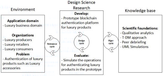 This paper adopts the Design Science Research (DSR) method for addressing the formulated research questions. DSR provides a rigorous framework for creating and evaluating new software artefacts represented as models and prototypes []. The DSR framework contains three main pillars. Namely, environment, information system research and knowledge base. The environment pillar outlines the application domain of this research. The business domain considered in this research is the luxury domain and the focus is on using blockchain to verify the authenticity of luxury products. The knowledge base provides the scientific foundations for this research. We apply qualitative analytics (QA) to understand the current authentication process of luxury products and identify problems that exist in them. We apply the trustable DApp modelling (T-DM) approach to specify the requirements and architecture of the proposed blockchain platform for authenticating luxury products. We further apply Peer debriefing (PD) for validating the chosen technology stacks for implementing the proposed platform. Lastly, the middle pillar of the DSR shows the assessment of the developed software artefact. We apply use-case simulations of various operations in the proposed authentication platform to evaluate the developed prototype.
