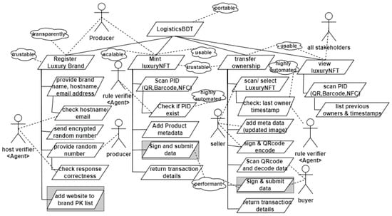 The main functional requirements of the LogisticsBDT application that describes the value propositions in authenticating and verifying luxury products include: register the brand, mint luxury NFT, transfer luxury NFT, and view luxury NFT. These main functions are refined into subfunctions as shown in Figure 3 and further described below. Software properties that describe the non-functional requirement of the system and the agents that execute the system functions are attached to the listed functions following the inheritance rule. The greyed functions represent the functions when executed, and results in a status change of the blockchain.