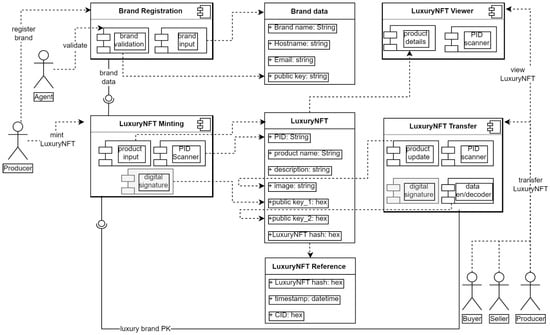 The static architecture representation of LogisticsBDT is derived by heuristic mapping of the main functions of the application specified in the requirement diagram. The architecture shows the main components, subcomponents, interfaces, and users (or agents) that interact with these components as shown in Figure 4. In addition, the data model that shows the output of interaction with these components is attached to the relevant components and interfaces. The main components of the LogisticsBDT application are brand registration, luxury NFT minting component, luxury NFT transfer component, and the viewer component. The grey part of the sub-components represents components where interactions with them results in exchange of tokens.