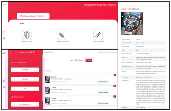 Figure 5 displays sample user interfaces of the implemented application. At the top left of the figure is the first screen of the application that allows a user to register as a luxury brand, mint a luxury NFT, transfer a luxury NFT, and view the history of a luxury NFT. At the bottom left of the figure is a screenshot showing the result of a searched luxury NFT using the QR code attached to the product. The sample result shows that the luxury NFT already has three history transactions associated with it.
