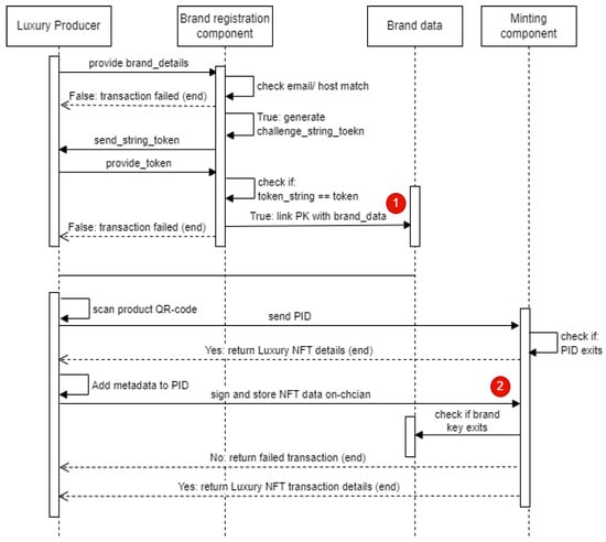 To mint a luxury NFT, the luxury producer scans the QR code of a physical product to read the PID. The PID is sent to the minting component. The component verifies if an NFT already exists with the same PID. Otherwise, the luxury producer updates the PID with metadata outlining the name, description and pictural representation of the product. The data is signed and sent to the minting component. The minting component again checks if the PK of the signed minting transaction is linked to any brand data. The transaction details are returned to the luxury producer, or else the transaction fails. The red-numbered transaction 2 denotes the second on-chain transaction showing that the transaction of storing minted NFT on-chain results in the state change of the blockchain.