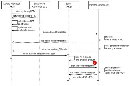 To transfer a luxury NFT, the producer selects an NFT from the list of returned NFTs and updates the NFT metadata by providing the current picture representation of the physical product. The updated information is signed and sent to the transfer component that checks based on the on-chain data if the Pk linked to the NFT belongs to the luxury producer, then generates a transaction receipt (embedded in a QR code) if the check is successful. The luxury producer shares the signed transaction receipt with a buyer. The buyer scans the transfer QR code and decodes the NFT information and the signature contained in the transfer receipt. The buyer checks the NFT metadata with the physical luxury product and, if satisfied, signs the transaction and sends the data to the transfer component. The transfer component finally checks the validity of the two signatures contained in the received transfer transaction, as well as the timestamp showing the correct historical ownership of the NFT. If the signatures are valid and the timestamp of the product ownership shows the last owner is Pk1 (luxury producer), the NFT is transferred to the buyer (Pk2) and the list of luxury NFTs connected to the buyer’s Pk is returned. The red-numbered transaction 3 denotes the third on-chain transaction that results in the status change of the blockchain. Hence, the transaction involving the buyer appending the signature on the initial transaction generated by the seller and storing the completed transfer transaction on-chain results in the state change of the blockchain.