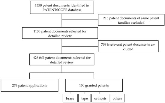 Using the PRISMA statement [] as a basis, the patent review process shown in Figure 1 has been followed. The identification stage of the search retrieved a total of 1350 patent documents. Patent documents that were from the same patent family were removed. A patent family is a collection of patent applications covering the same or similar technical content and sharing the same priority date. Patent documents were manually checked, and parent patents were kept for further analysis. 215 patent documents that were from the same patent families were manually removed from the results. The patents’ titles, abstracts, and claims were extracted and thoroughly assessed to investigate the relevance of the patents on ankle sprain prevention methods before further analysis. From the remaining 1135 patent documents, 709 patent documents were further excluded, as they were deemed irrelevant upon manual examinations. These include patents for ankle rehabilitation devices; inventions that prevent other ankle injuries, excluding ankle sprains; and inventions that indirectly prevent ankle sprains (for example, the design of a brake pedal for a vehicle). The remaining 426 patent documents were classified into granted patents and patent applications. In total, 276 documents are patent applications, and the patents that have been granted came to a total of 150 documents.