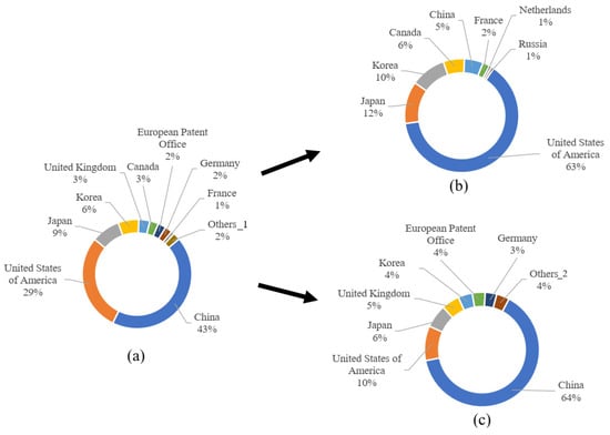 Figure 3a shows the different countries that have published patents on ankle sprain prevention methods. China published the greatest number of patents, accounting for 43% of the overall published patents. This is followed by the United States of America, Japan, and then Korea, with 29%, 9%, and 6%, respectively. Others_1 refers to countries that published only a single patent, which includes South Africa, Australia, India, Mexico, Netherlands, Philippines, Portugal, Serbia, and Russia.