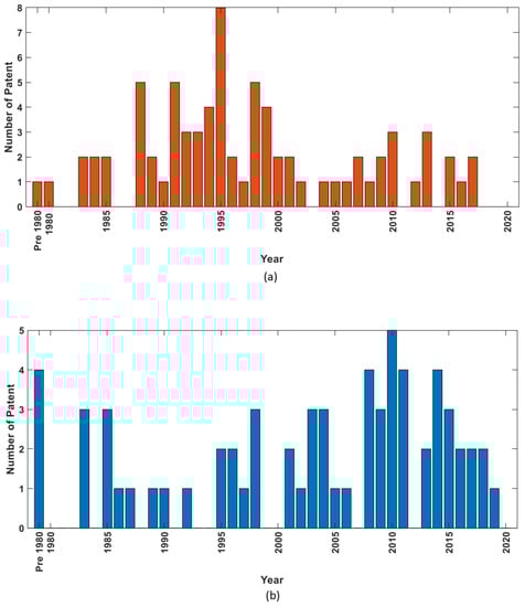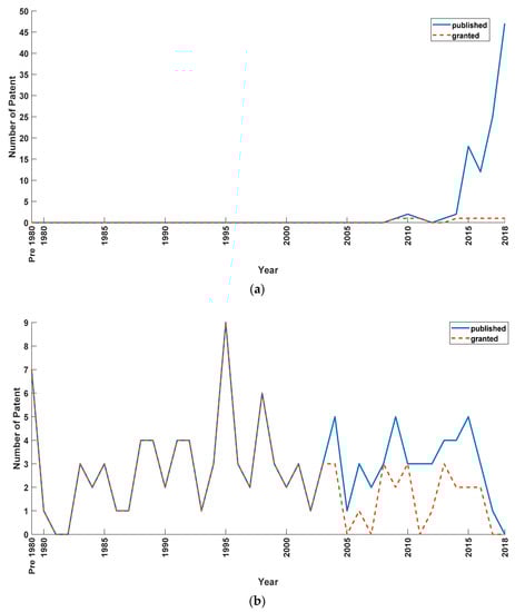 The number of published and granted patents by the two most active countries, China and the United States of America, by publication year are shown in Figure 4a,b, respectively. Although China has published the greatest number of patents (according to Figure 3a), it is observed in Figure 4a that China only started publishing patents on ankle sprain prevention methods in 2009, hence its relatively smaller percentage of granted patents (as seen in Figure 3b), with an exponential increase in publications in the later years. This contrasts with the United States of America, which has been publishing and granting patents on ankle sprain prevention methods as far back as before 1980, as can be seen in Figure 4b. A feasible reason for China’s recent interest in patents may be due to the national strategy plans implemented by the Chinese government, including the Outline of the National Medium- and Long-Term Science and Technology Development Plan (2006–2020) [], which proposes the goal of reaching the top five in the world in terms of the annual number of patents granted to nationals by 2020, and the National Patent Development Strategy (2011–2020) [], which sets a quantitative goal of quadrupling the number of patent applications by 2020. China’s recent interest in patenting ankle sprain prevention methods could also explain the smaller percentage of patents granted (as shown in Figure 3b), as it normally takes time for patents to be granted. However, a comparison of the data shown in Figure 4a,b shows that the percentage of published patents that were later granted was significantly lower for China than for the United States of America. Luan and Zhang [] have suggested that the China National Intellectual Property Administration, previously known as the State Intellectual Property Office of China, is slower at patent examination due to the overwhelming growth of patent filings in China.