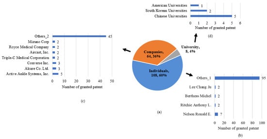 Patent applications may come from an individual company or university. Categories of applicants of granted patents are shown in Figure 6a. Around 60% of the applicants are individuals, 36% are from companies, and 4% are from universities, indicating more interest among individuals in developing ankle sprain prevention methods than companies and universities. Generally, the higher numbers of patent applicants from individuals indicate early-stage technology. Individual inventors normally intend to form start-ups to develop their inventions further to a commercialisable stage, before bigger companies start taking an interest in the inventions and granted patents, either through assignment or licensing of patents or takeover of the original start-ups.