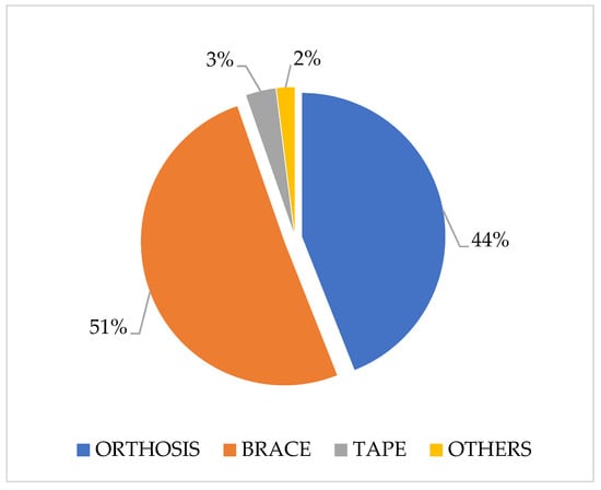 Finally, the patents on ankle sprain prevention methods are categorised into braces, orthosis, tape, and others. According to Figure 7, approximately 51%, or 76, of the 150 granted patents are associated with braces; 44%, or 66, are related to orthosis; 3%, or 5, are related to tape; and the remaining 2%, or 3, are associated with other types of ankle sprain prevention methods. Inventions that have been classified as orthosis and braces are more common than taping methods. This is unexpected, as orthosis is not as well-researched as bracing or taping. Evans and Clough [] have identified three scientific articles on orthosis; however, no data on injury prevention were given. Although the effectiveness of orthosis in the prevention of ankle sprains has not been adequately documented, inventions classified as orthosis are more protected than ankle tapes. It has been found that two of the three patents classified under others are on modifications to sporting equipment, while the other one involves myoelectrical stimulation. No prevention training method for the prevention of ankle sprains has been patented.
