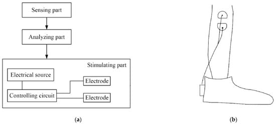 One such orthosis for general use was invented by W. Thais and W. Kauth in 1985 []. It is described as a shoe with an ankle protector consisting of a support panel along the lateral side that is kept secure with adjustable straps, as shown in Figure 12a. The strap adjustment prevents inversion or internal rotation of the ankle and, thus, prevents ankle sprains. Published in 2004, J. D. Harry et al. invented an orthosis for general use []. The wearable system is capable of applying neurological stimulation to the foot and the ankle via surface electrodes or vibrational actuators in or on the wearable platform, as shown in Figure 12b. A non-deterministic random signal, generated by a bias signal generator that is coupled to a controller, is used to drive the actuators and electrodes. Neurological stimulation enhances the neurosensory stimuli of the foot and ankle and, thus, enhances human balance and gait, which in turn reduces the likelihood of ankle sprains. The latest patent on a general orthosis was invented by X. F. Weng []. It is a sock comprising a sock body and a cloth piece, with the sock body consisting of a bottom plate and an anti-bending block fixed to the wearer with belts and fasteners, as shown in Figure 12c. The bottom plate and the anti-bending block are made of high polymer graphene material, making the device lightweight, but robust. The lower part of the anti-bending block and the foot-fitting surface of the bottom plate are covered with latex pads. Additionally, the sock also contains a storage bag to keep a cooling agent, which can either be dry ice or alcohol liquid, to allow icing of an injured ankle.