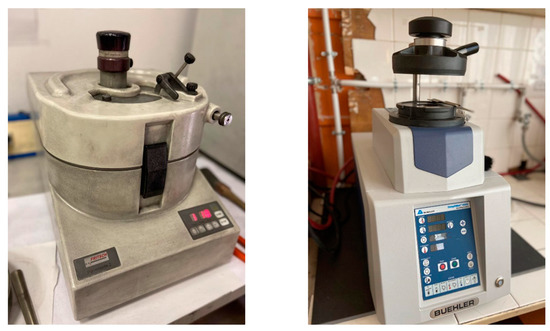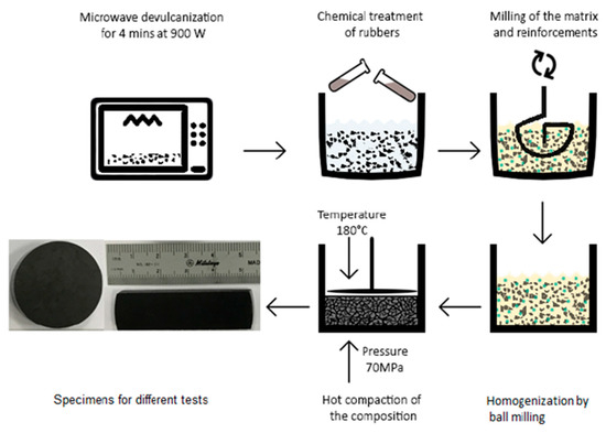 For the manufacturing of recycled rubber-epoxy composite, good quality of bonding between matrix and reinforcements is required, however, recycled rubbers do not carry any free chains to form new bonding with epoxy resin because of the former vulcanization process. In order to improve the interface quality between epoxy and rubber, fresh scrap rubber should be devulcanized. During the devulcanization process, sulfur links are attempted to be broken and other new links are generated, then the flowing capacity and interaction of recycled rubbers with other substances are increased. After determination of the reinforcements with matrix in wt%, a special process is applied to successfully complete the manufacturing of the composites. This process involves silanization of the recycled rubber and devulcanization before blending it with epoxy resin and reinforcement. Chemical treatment followed by devulcanized recycled rubber is mixed with epoxy resin for obtaining a strong chemical-bonding diffusion reinforced with different reinforcement. After blending the mixture, they are milled for 4 h by adding “Zn-Stearate” as a lubricant for homogenous distribution. For manufacturing of the composites, hot compaction is carried out at 180 °C for 20 min under the pressure of 70 MPa; after that, the specimens are produced with a diameter of 50 mm—a similar procedure is given in Figure 2. The equipment used during the process is also presented in Figure 3.