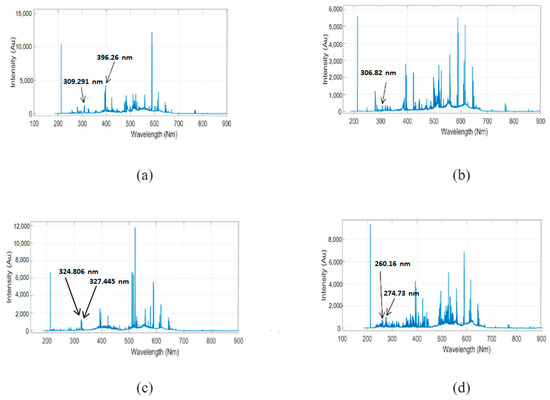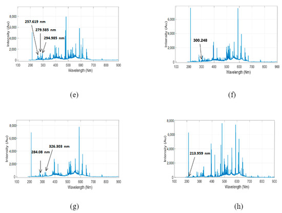A data adjustment was made to eliminate false detection caused by using the non-adjusted dataset. Every substance has its own intensity value in a specific wavelength interval, as it is shown in Figure 4. For instance, Al has its peak value at 309.291 nm and 396.29 nm, while Bi has it at 306.82 nm. Cu has been detected at 324.806 nm and 327.445 nm, Fe at 324.806 nm and 327.447 nm, while Mn has three different intensity values at 257.619 nm, 279.585 nm, and 294.985 nm. Ni has a peak intensity at 300.248 nm. Sn is detected at 284.08 nm and 326.303 nm, while Zn has a peak value at 213.959 nm. Dataset adjusted in the direction of these peak values for each class. By focusing on its own peak values for each substance, the new dataset was created based on the circumference of the wavelength that belonged to the peak values.