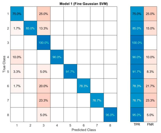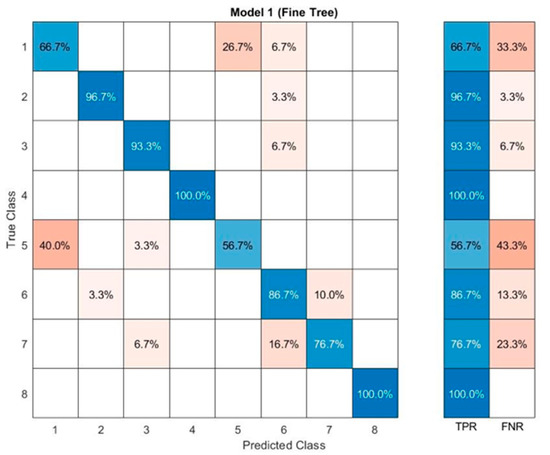 Confusion matrices show the accuracy of training, the blue diagonal is interpreted as a true-positive detection of the related class, and the orange boxes belong to the false-negative detection according to the giving response. Total of the true positive over eight gives us the total accuracy of training, so the total accuracy of the unadjusted dataset with the fine tree model is 84.6%. One by one, the confusion matrices can be interpreted as below.