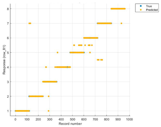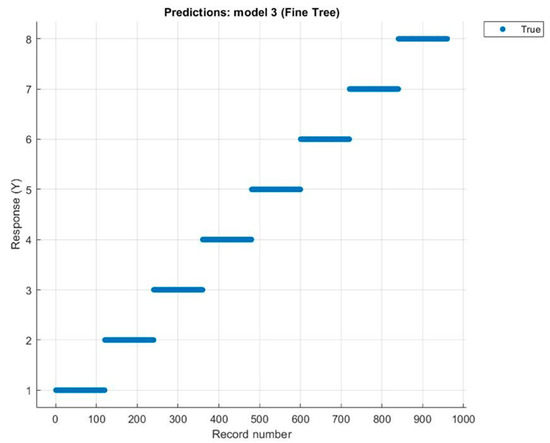 As it is mentioned above, 120 responses were determined for each category separately, so Y is defined as 960 responses for eight classes. This gives us the accuracy and errors for the total and for each class. During the model-making classification, these defined response data are taken as a basis for true classification. The classification graph of the response data is shown in Figure 6.