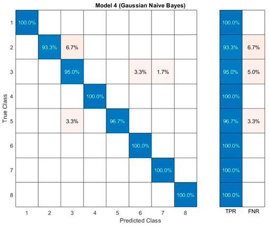 The Gaussian Naïve Bayes classifier gives 98.125% accuracy and predicts five classes as truly, which are Al, Fe, Ni, Sn, Zn. The worse classification is bismuth, and the worse percentage is 93.3% (Figure 10). However, the classifier gives better results than the previous models.