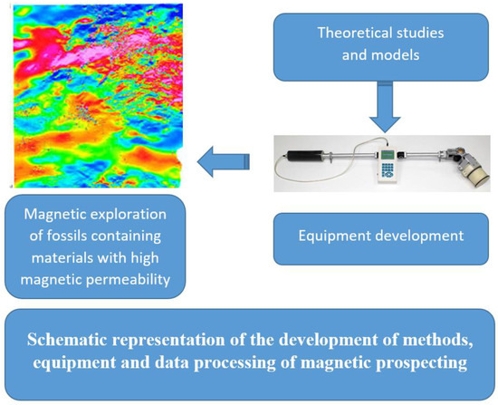 Figure 1. Schematic representation of the development of methods, equipment, and data processing of magnetic prospecting.