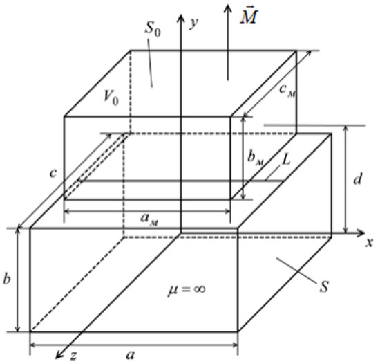 The magnetic field of the system shown in Figure 7 was calculated. The permanent magnet and ferromagnets have the shape of a parallelepiped. The centers of these parallelepipeds lie on the y axis. The magnet is magnetized uniformly along the y-axis, i.e., M = M e y . Therefore, ρ = 0 in the volume of the magnet.