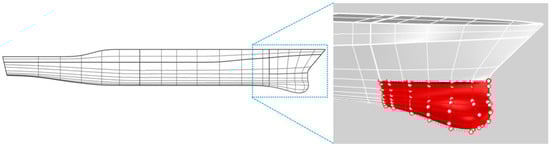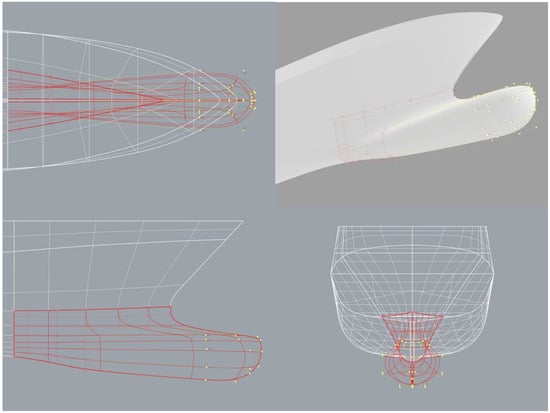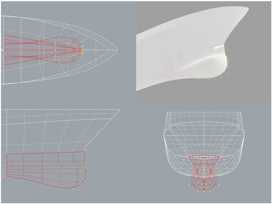 The zoom-in blue frame of Figure 1 shows the main target object in this study: the sonar dome integrated with the ship’s bow. In Figure 1 right, the part in red is the NURBS surface of the sonar dome with the control points (red hollow points). It is an independent part to change the geometry on the ship’s hull, and the other part of hull geometry is fixed. The distribution of the control points around the original sonar dome is illustrated in Figure 2 in detail and multiple views. Among the control points, the yellow hollow points are selected to protrude the dome geometry forward as demonstrated in Figure 3. The protruding distance of all selected control points is defined as and explained in Figure 3a. The range of length variation is = 0–0.24 m. As a result, the different lengths of the sonar dome variations are generated, simulated in the present work, and then compared with the result of the original sonar dome. The nomenclature of the sonar dome variations is and F stands for forward protrusion. For instance, the optimal dome (see Section 4.2) is F0.225 which means the dome with = 0.225 m. The details of the distribution of the control points around the F0.225 dome after the geometry change are displayed in Figure 4. Accordingly, the original sonar dome is identical to F0, i.e., = 0. F0 represents the original sonar dome in the rest of this paper.