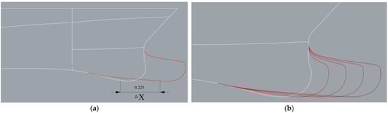 Protruding sonar dome geometry. (a) Protruding distance of control point; (b) sonar dome shape variations. White lines are the geometry of the ship’s hull and original sonar dome. Red lines are the different sonar dome configurations in this study.