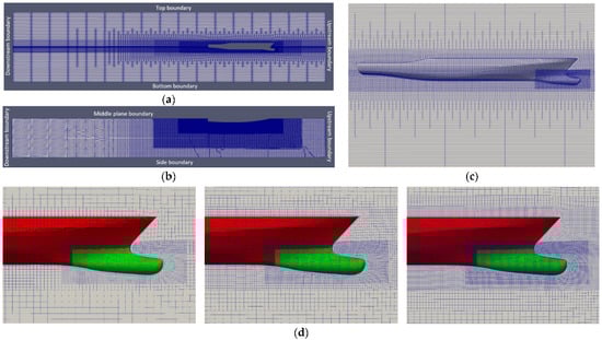 Grid generation for the ship with the optimal sonar dome (F0.225): (a) y = 0 plane (medium grid); (b) z = 0 plane (medium grid); (c) near ship’s hull (medium grid); (d) near ship’s bow and sonar dome (left to right: coarse, medium, fine grid explained in Section 3.3.1).