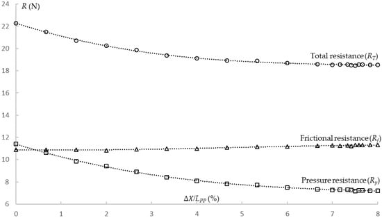 Table 5 shows the resistance result for total resistance (RT) and its components: pressure resistance (Rp) and frictional resistance (Rf). In the table, the ratio /LPP of the sonar dome’s length protruding forward and the ship’s length LPP is also listed as a percentage to give a sense of how long is compared to the whole ship. The trend of RT, Rp, and Rp to /LPP, is drawn in Figure 6, respectively. The resistance reduction Rd of the sonar dome with a different length from F0 is defined as: