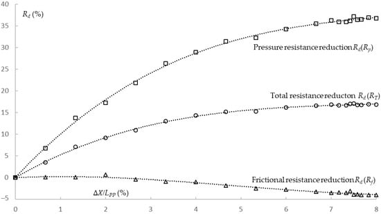 As R = (RT, Rp, Rp), the total resistance reduction Rd(RT), pressure resistance reduction Rd(Rp), and frictional resistance reduction Rd(Rf) is calculated, respectively. The trend Rd(RT), Rd(Rp), Rd(Rf) to /LPP, respectively, is drawn in Figure 7.