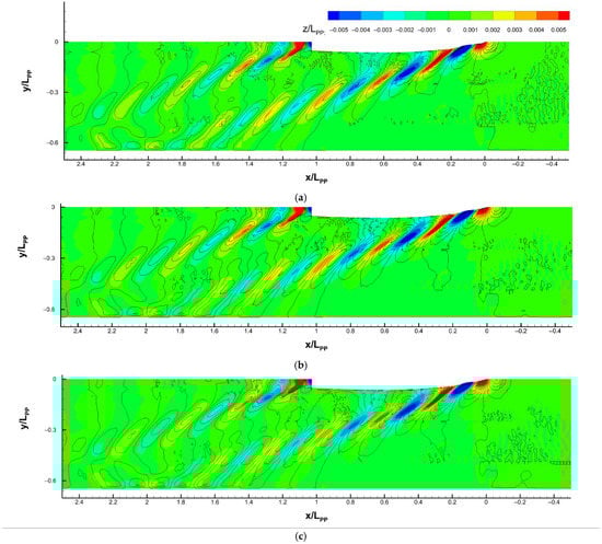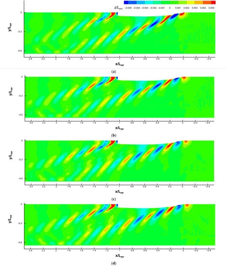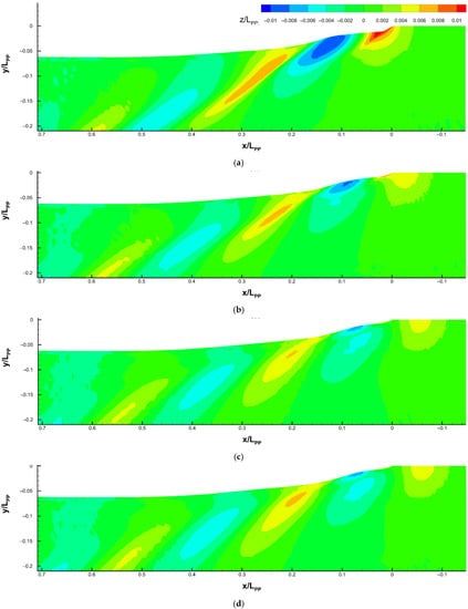 In addition, since the towing tank side wall is simulated, in Figure 8, the bow waves reflect on the side around x/LPP = 1.96 for F0, 1.95 for F0.14, and 1.92 for F0.225 and F0.45. The angle between the wave envelope and middle plane can be calculated as around 19 degrees, close to the theoretical value []. The theoretical value for the wave length and envelope angle is based on a single point of the moving pressure source. Since the pressure is a distribution along the ship’s surface in our case, the ship-making waves are more complicated.
