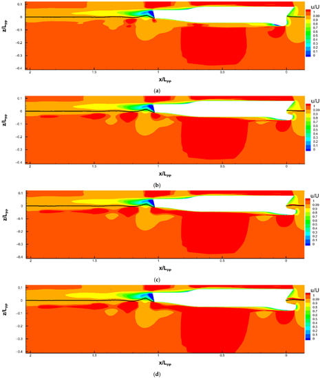 In Figure 11, the axial velocity distribution around the ship’s hull and far field on the middle plane (y = 0) is provided for F0, F0.14, F0.225, and F0.24. The length in x and z direction are non-dimensionalized by the ship’s length LPP. The axial velocity u is non-dimensionalized by the ship’s speed U0.
