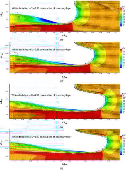 Velocity flow field around the sonar dome (on y = 0 plane): (a) F0; (b) F0.14; (c) F0.225; (d) F0.24. U = U0.