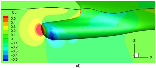 Pressure coefficient (Cp) distribution around the ship’s bow and sonar dome: (a) F0; (b) F0.14; (c) F0.225; (d) F0.24. The black line is the free surface profile on middle plane and ship hull surface.