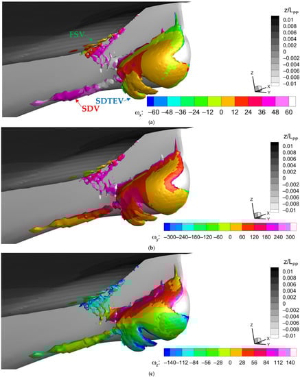 Vortical structures around the original sonar dome (isosurface of Q = 500) with the contour flooded by the color of: (a) x-vorticity (ωx); (b) y-vorticity (ωy); (c) z-vorticity (ωz).