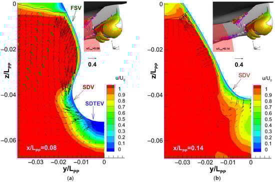 To understand the vortical structures around the sonar dome, Q-criterion [] based on non-dimensional velocities is applied in this section. For F0, the isosurface of Q = 500 covered by the color flooded contour of ωx, ωy, and ωz is illustrated, respectively, in Figure 15a–c to indicate the flow rotational direction. The ωx, ωy, and ωz are the non-dimensional vorticities in the x, y, and z direction. As pointed out in Figure 15a, several kinds of vortex can be observed and categorized: SDV = sonar dome (side or tip) vortex, SDTEV = sonar dome trailing edge vortex, and FSV = free surface vortex. To examine the vortex phenomena, the axial velocity (u/U0) distribution and vector field (v/U0, w/U0) around the F0 sonar dome are plotted on the x/Lpp = 0.08 plane in Figure 16a and the x/Lpp = 0.14 plane in Figure 16b. SDV and SDTEV are the major phenomena that were also explored in [,] for the DTMB 5415 hull, and the terminology of [,] is adopted here.