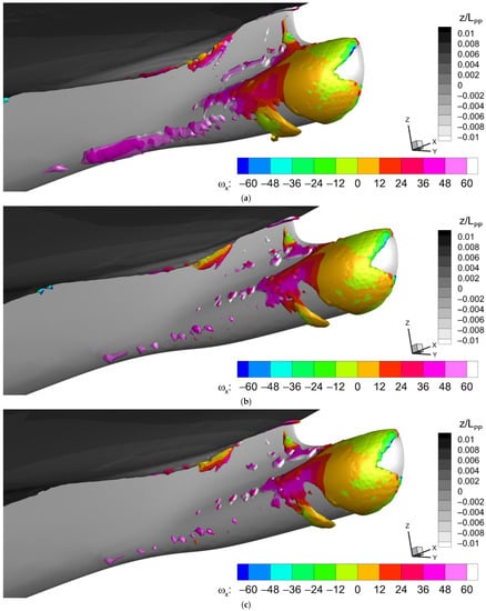 The SDTEV results from the flow separation behind the sonar dome back slope, i.e., the trailing edge, as discussed in Section 4.4 and Figure 12. The region of ωy = 0–60 on the SDTEV in Figure 15b agrees with the vector direction of the reverse flow in Figure 12a. In Figure 15c, the high −ωz on the SDTEV indicates the cross-flow rotation inside the flow separation exists, which is induced by the SDV. As shown in Figure 16a, the SDV rotates counter-clockwise, and correspondingly, the SDTEV rotates clockwise into the separation area (in dark blue). The SDTEV does not last long. It is much shorter than the SDV as presented in Figure 15. Moreover, in Figure 16b, only the sonar dome wake is left beneath the ship’s bottom.