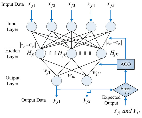 The ARBFN consists of the input, hidden, and output layers. The signal propagation and the basic function of each layer are described in [19]. The ARBFN structure is shown in Figure 1 and the “ACO” process is performed in the training stage. The learning rates are adjusted by ACO as stated below. The ACO technique finds the optimal solution using a population of ants. The population size is set to and the dimension is set to . The generation ants are , where , and are the ARBFN learning rates. To evaluate the accuracy of the ARBFN in testing, the mean absolute percentage error (MAPE), as calculated with (13), is used in this paper.