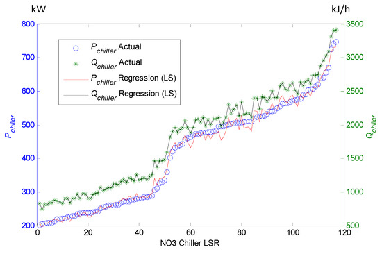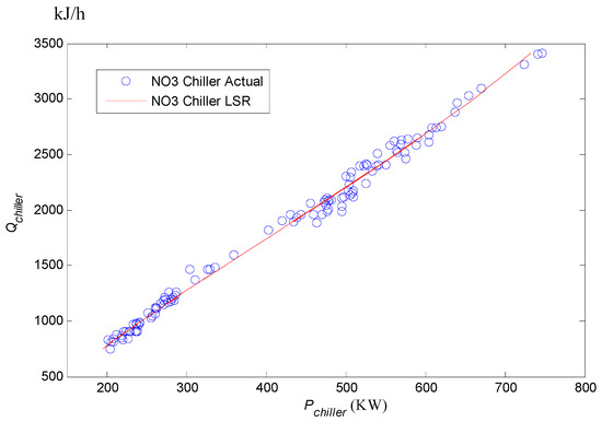 The collected data are used to plot the distribution of power consumption and cooling capacity. Figure 2 shows that although the power consumption and cooling capacity data of the NO.3 chiller are chaotically scattered, they generally exhibit a proportional rising. Equation (8) is used in this paper to construct the third-order polynomial function of power consumption using LSR. Therefore, Figure 2 shows that the relationship between and is almost linear. The constructed corresponding output function is shown in Figure 3 and Table 1 shows the coefficients of the polynomial functions for chillers and ice-storage tanks constructed by LSR.