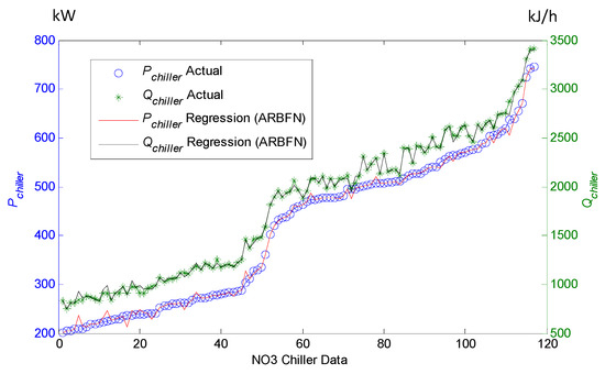 where and are the actual data of the chiller and ice-storage tank, and are the ARBFN regression data, and U is the number of testing data.