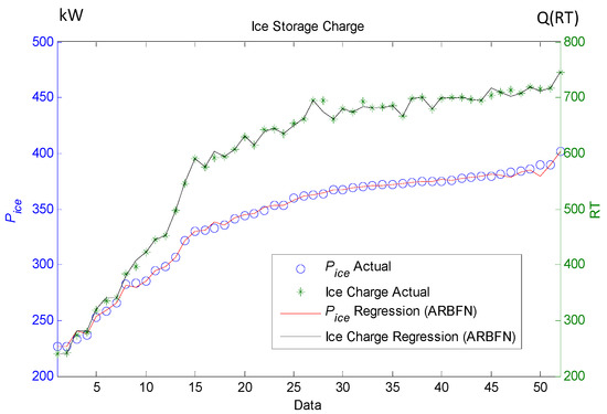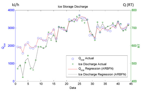 The ARBFN is used to construct the function model of the hourly ice storage of the charge process net for the ice-storage tank as shown in Figure 5. The ARBFN is used to construct the function model of the hourly ice melting of the discharge process net for the ice-storage tank, and the association between the cooling capability and ice discharge is shown in Figure 6. If the melting ice volume of the ice-storage tank decreases, the cooling load will also decrease.