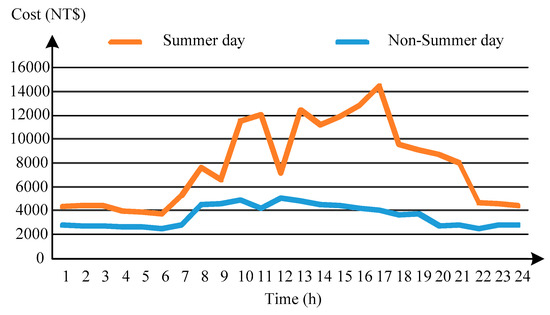Table 5 shows the operating status of chillers during 24 h periods on a summer day and a non-summer day. From Table 5, during off-peak hours when the cooling load is smaller, the ice maker stores the required cooling energy in the storage tank. During peak hours, the storage tank provides the required cooling load. Figure 9 shows the operating cost of chillers during 24 h periods on a summer day and a non-summer day. It can be seen in Figure 9 that the TOU rate will influence the overall economy of the ice storage air-conditioning system.