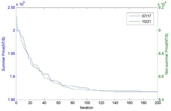 The convergent characteristics of operating costs on a summer day (17 July) and a non-summer day (21 October) are as given in Figure 10. Using ACO to optimize the energy planning for the ice-storage air-conditioning system can effectively reduce costs. The electricity savings are thus 4.130% on a summer day and 7.381% on a non-summer day. This system can also yield a better plan for ice storage and melting procedures.