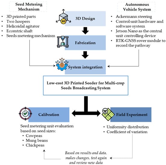 The developed autonomous seed broadcaster consisted of two main parts. The main focus was the development of a seed metering mechanism using low-cost plastic materials and an autonomous vehicle system in which to install a seed metering system that can be navigated along a pre-determined path using RTK-GNSS coordinates. The overall workflow of the technical roadmap is given to show the integration of seed metering mechanism and autonomous vehicle system (Figure 1).