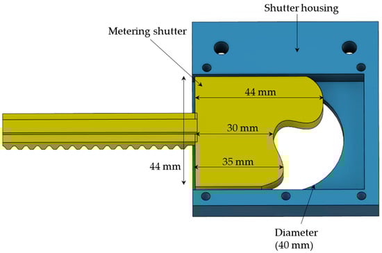 The seed metering mechanism was designed and developed based on two shutters: an ON–OFF shutter with a dimension of 44 × 44 mm (Figure 3) and a metering shutter. The main function of the ON–OFF shutter was to open and close the delivery port. Rack and pinion methods were used to move this shutter.