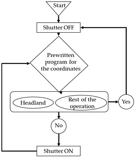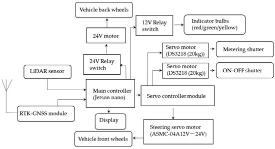 The steering system of this seeder was of the Ackermann steering type. This steering system has been used in mobile robots []. A 24 V high-torque robot servo motor (RCmall ASMC-04A, China) was used to control the steering. The 12 V signal tower (PATLITE® LE-01P, Komaki, Japan) was mounted on the vehicle frame to enhance the visibility of the seeder underworking conditions. A 10-inch portable monitor (ROADOM, Shenzhen Shinho Electronic Technology Co., Ltd., Shenzhen, China.) was used as the display, which was used for system configuration of the single-board computer. Figure 9 shows a flow diagram of the working principle of the seeder.