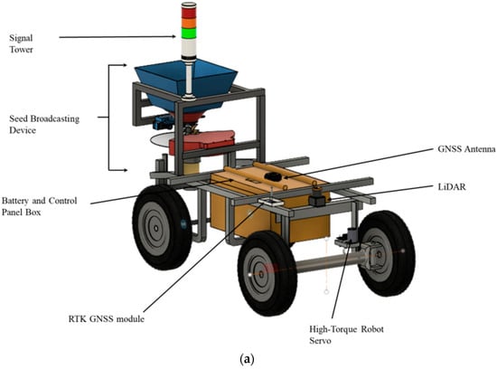 Design and fabrication of the multi-crop seeder in the modified vehicle based on Ackermann steering: (a) 3D design of the multi-crop seeder; (b) autonomous multi-crop seeder after fabrication.