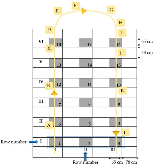 The proposed autonomous small-scale vehicle was used with different forward speeds in a grid-shaped field designed with a determined distance interval considering crop practices (Figure 14). The data were collected from the parcels of the grids after the operation. The number of broadcasted seeds was counted after performing experiments at three variations of vehicle speed (0.351 ms−1, 0.443 ms−1, and 0.521 ms−1), and the rotating disk for seed distribution was set to 186 rpm during the experiments. The vehicle speeds were determined based on a human working rate (manual broadcasting) since the aim was to develop an autonomous machine able to mimic field workers’ operations, with three speeds chosen accordingly. These vehicle speeds were controlled by changing the voltage on the DC power supply.